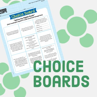 Our choice boards are graphic organizers comprising nine squares, with each square containing a different activity centered around a single Scope story, article, or poem. After reading, students can choose their own task(s) from the menu of offerings.